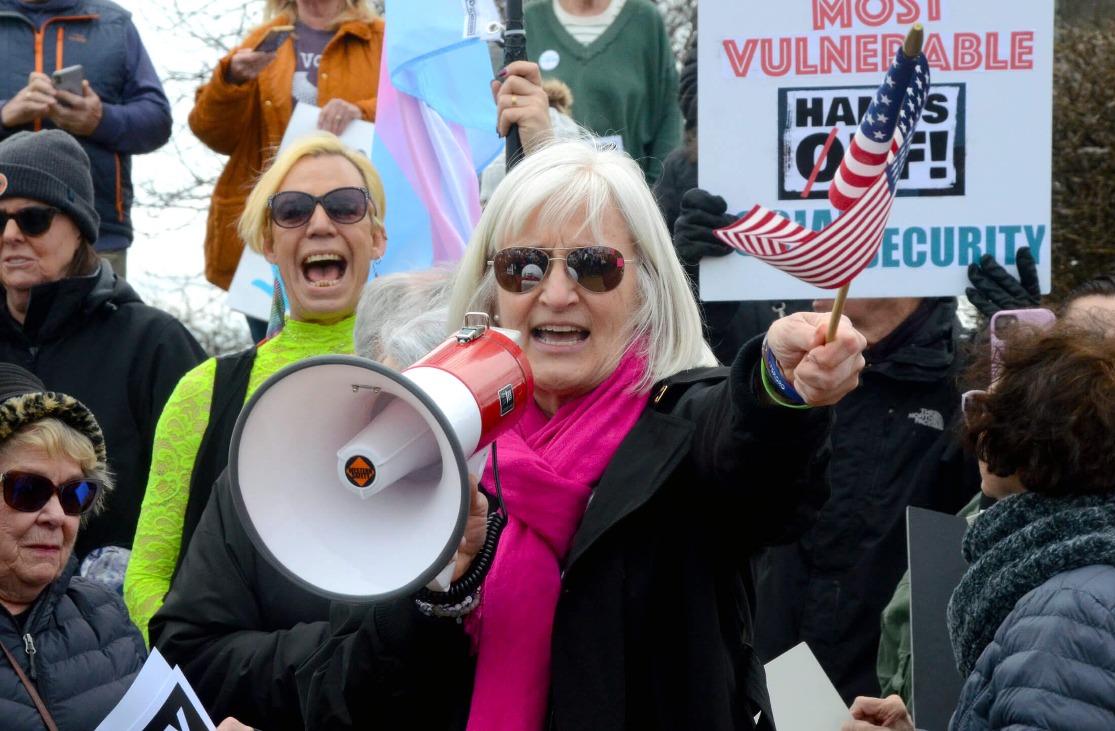 “Taking a chain saw to education, social security and health care just to fund a tax cut for billionaires makes me sick,” said Joan Miller. “I am very concerned for my grand children.”