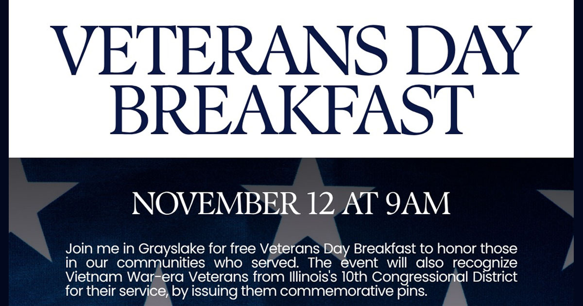 Congressman Brad Schneider is hosting a Veterans Day Breakfast on Wednesday, November 12 from 9:00 to 11:00am. Breakfast is free and open to all veterans in Illinois’s 10th Congressional District. To learn more and to RSVP, visit: https://www.eventbrite.com/e/veterans-day-event-tickets-1835303976599